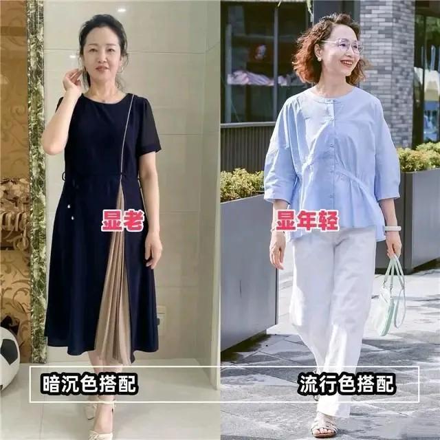 当然,就算是中年女性选择的衣服配色,也尽量不要过于暗沉。例如下面左边的这一件连衣裙,色彩穿在身上之后就会显老,换成右边的这套穿衣造型就完全不一样了,浅蓝色的衬衫搭配上白色的直筒裤,这样的色彩搭配会更显年轻。