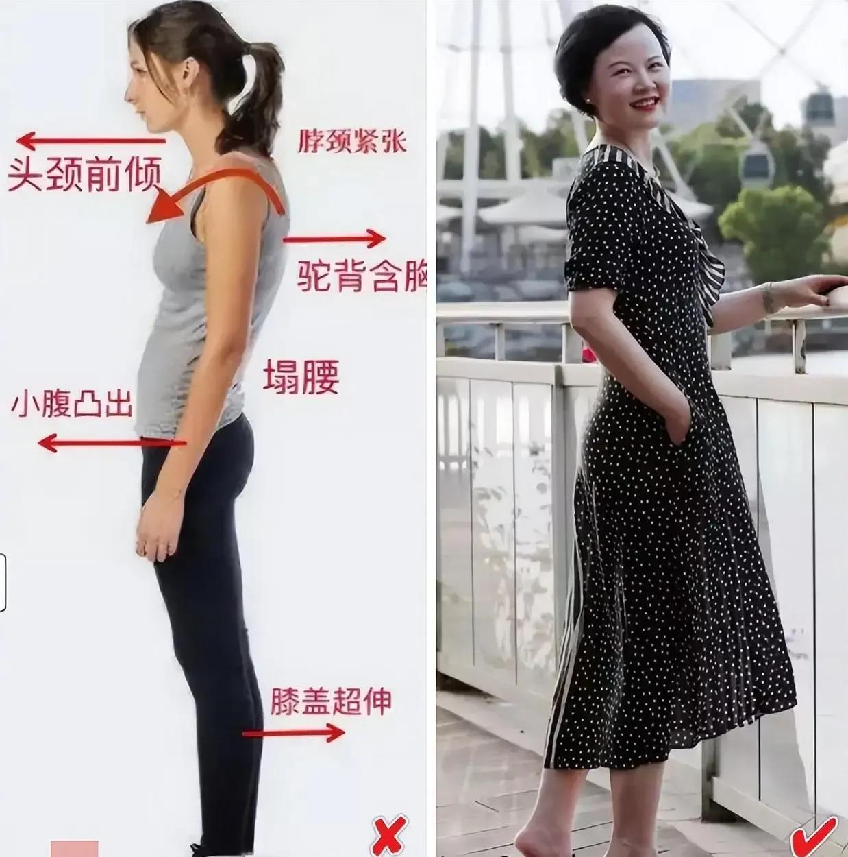 有一点还是很关键的,不管是18岁的美少女还是四五十岁的中年女性,好的体态能影响整个人的气质,大家看下面的对比图就可以得出一个非常明确的答案,如果头颈前倾,脖颈紧张,驼背,含胸,小腹突出,塌腰,膝盖超伸,那么就算你身材纤瘦,整个人看起来也未必好看。但是当你的身材挺拔,整个人的气质是完全不同的。
