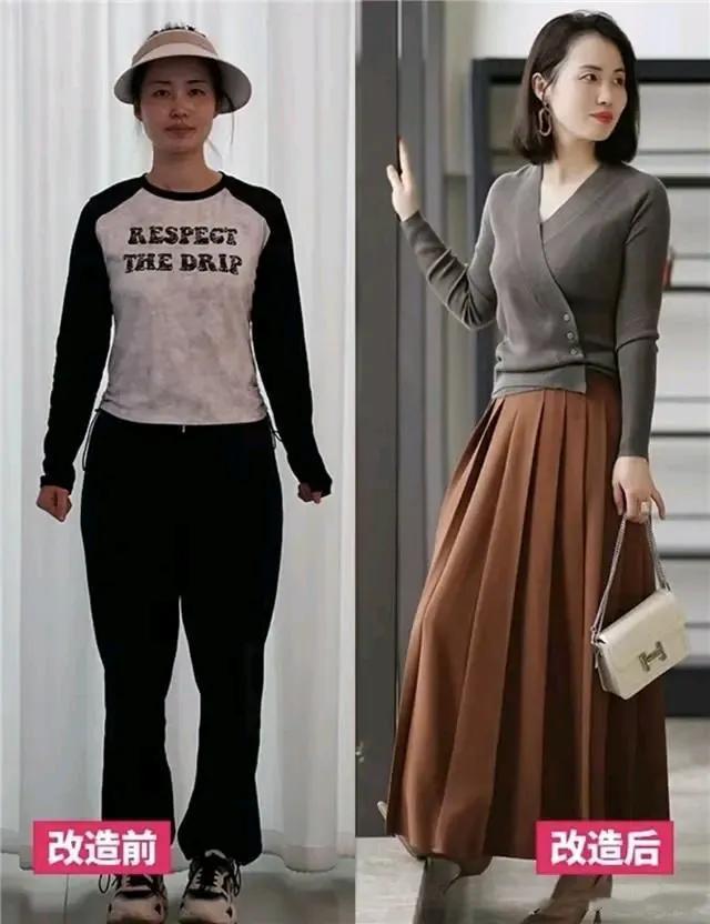 长相普通,但穿衣打扮尽量不要过于普通,大家看下面改造之前的穿衣造型和改造之后的对比,真的区别太大了,本身这位模特是梨形身材,画框腿粗,如果只是用一件拼接色的上衣搭配上一条黑色的长裤,呈现的效果普普通通。